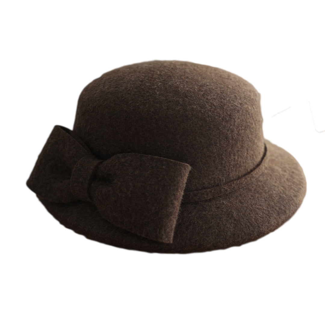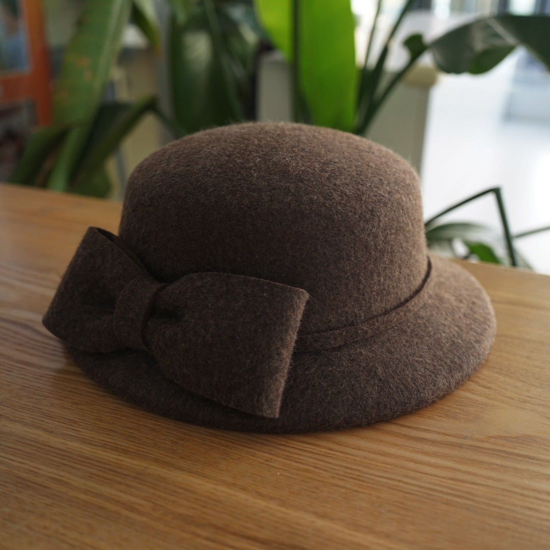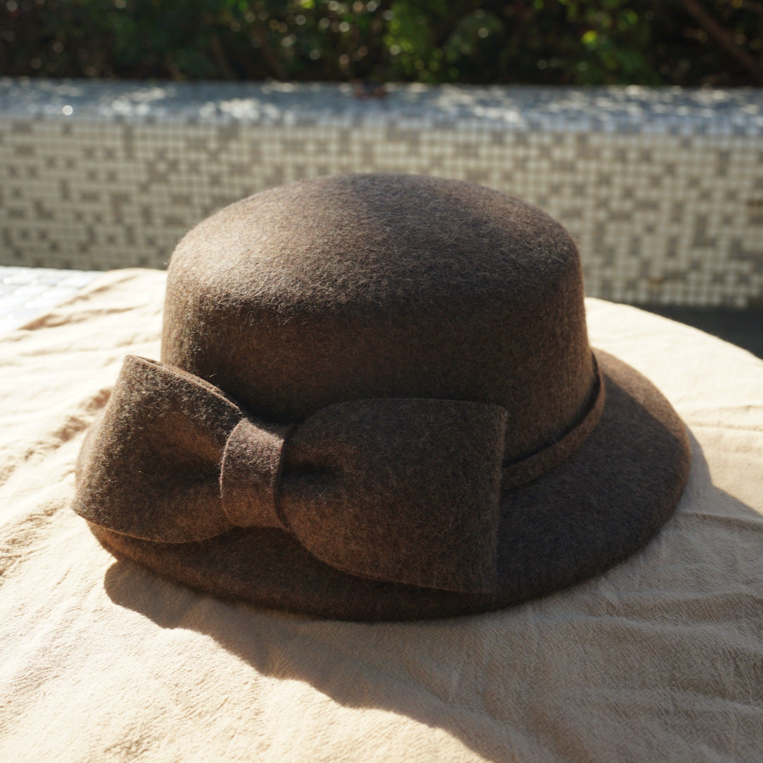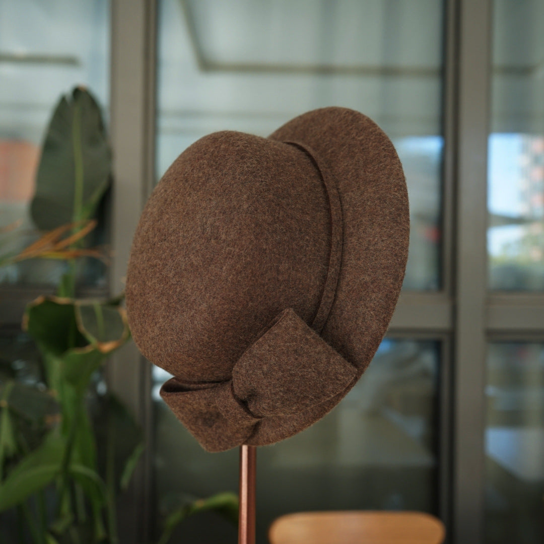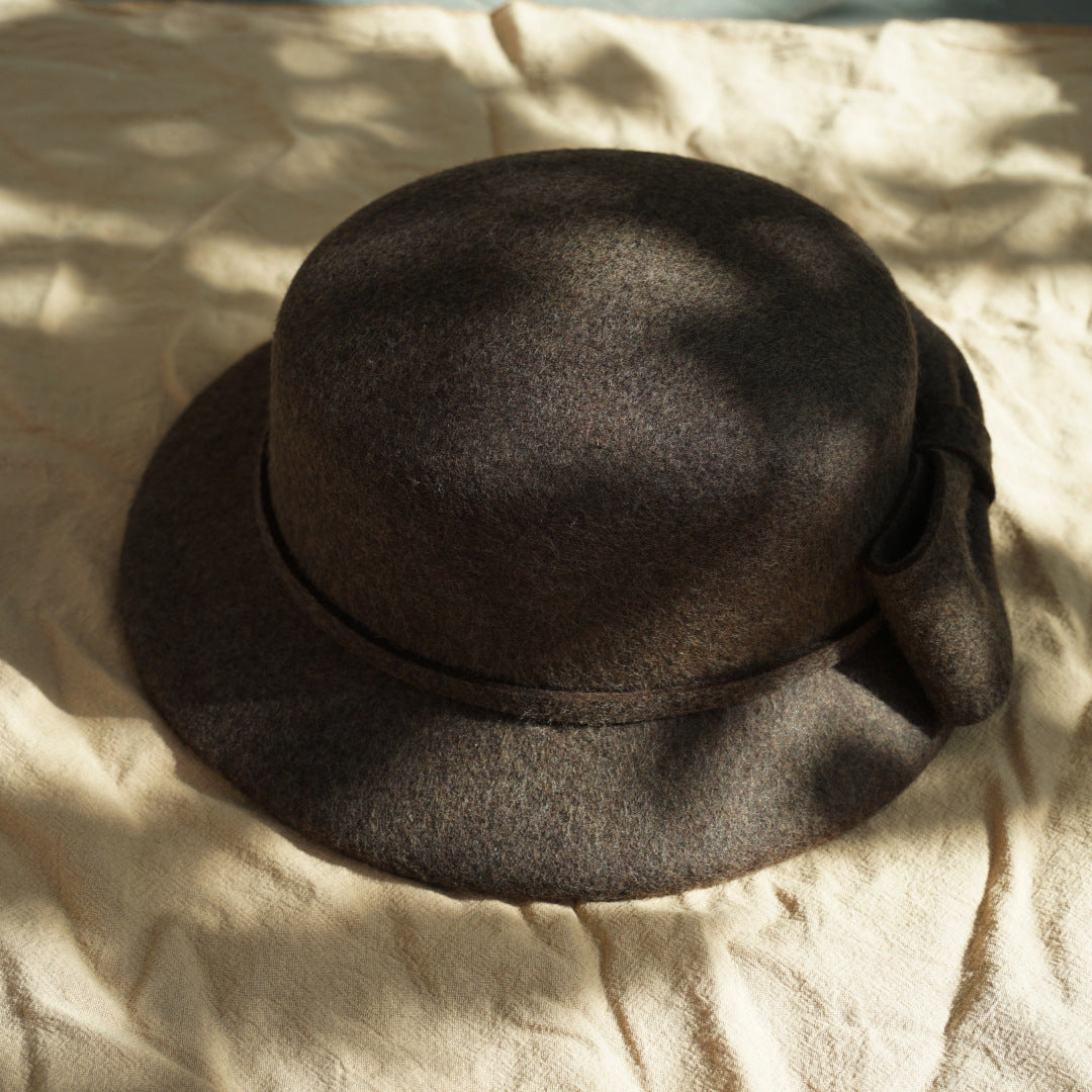 フランス復古ヘップバーン茶色カレー色リボンウールうシルクハットの毛中折れ帽日系秋冬女优雅盆帽